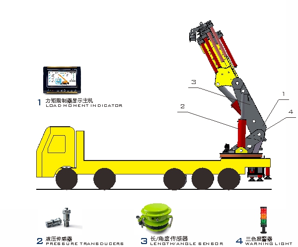 折臂吊力矩限制器主要由力矩限制器顯示器、長/角度傳感器、液壓傳感器等組成。通過各傳感器檢測信號,可以實時在顯示器上顯示起重機的額定起重量、實際起重量、角度、作業幅度等信息,并根據情況輸出報警信號和控制信號,輔助作業人員安全操作起重機。